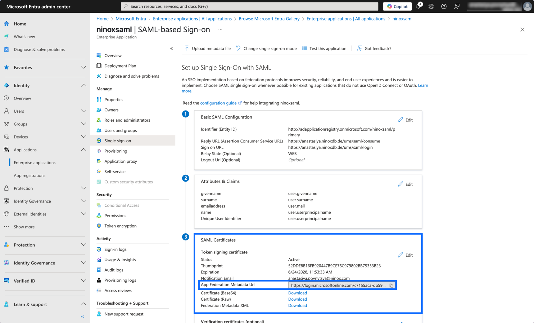 - Under SAML Certificates, copy the App Federation Metadata Url. This is the Ninox single sign-on URL you'll need in the next step, Enter Microsoft values. In the screenshot below, you'll see an example value.