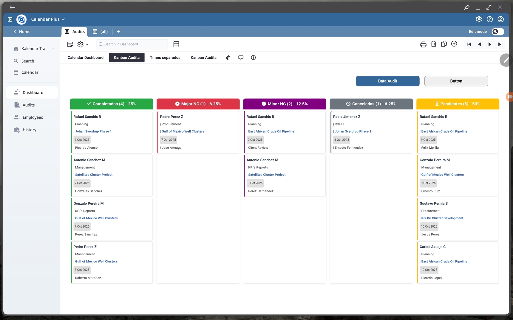 Interactive visual audit Calendar + Kanban that validates date ranges (maximum 1 year in the future/past), filters weekdays excluding weekends, and presents a responsive HTML table with employees and their scheduled audits.
