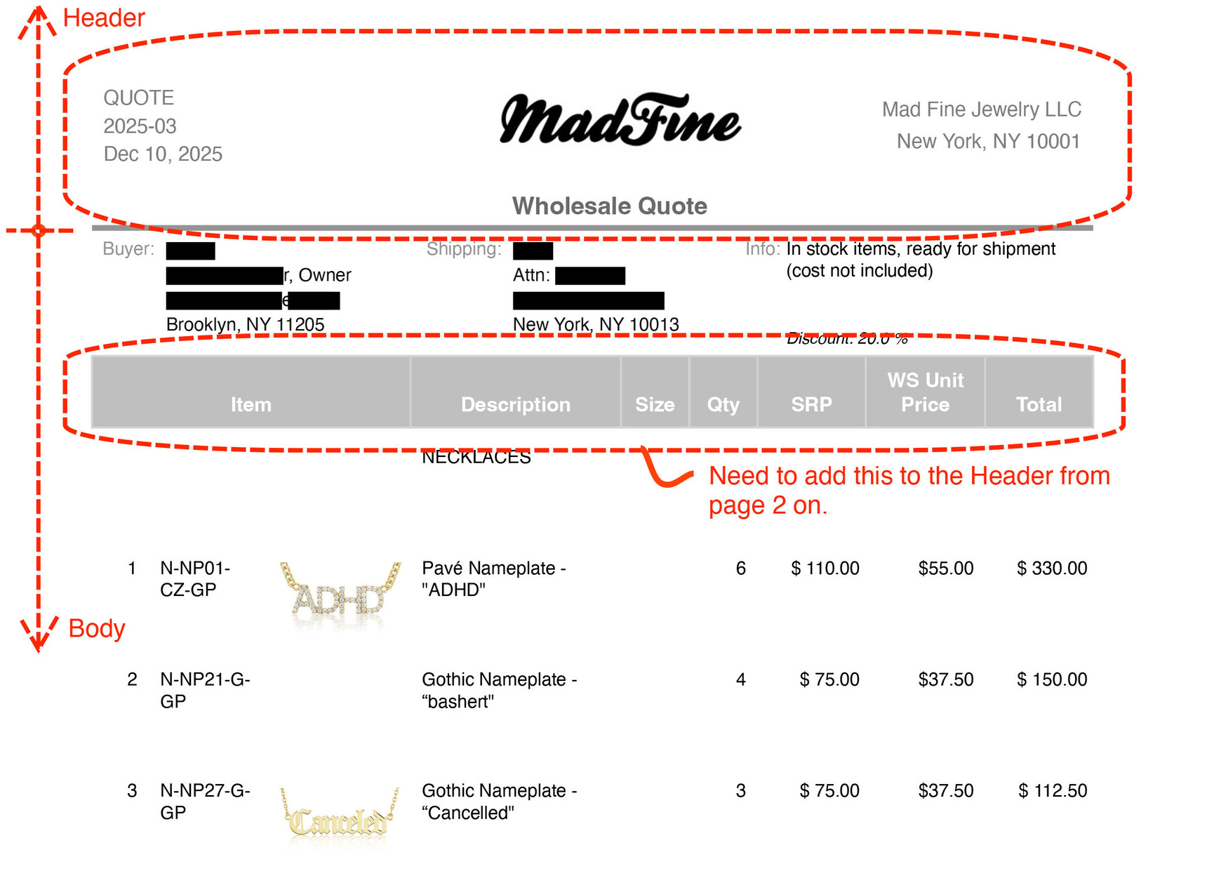 Using a local Mac Ninox app 3.17.16, I print invoices (in this case a Quote) using 'print layout'. I'd like a slightly different header on page 2 and onward, repeating the gray graphic with labels on each page (dropping the client info from page 1). Is this possible within the app itself?