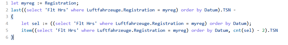 let sel := ((select 'Flt Hrs' where Luftfahrzeuge.Registration = myreg) order by Datum);