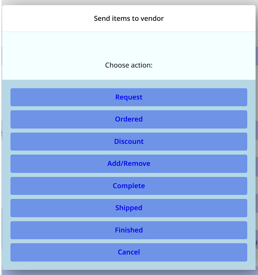 let action := dialog(html("Send items to vendor"), html(htm), ["Request", "Ordered", "Discount", "Add/Remove", "Complete", "Shipped", "Finished", "Cancel"]);