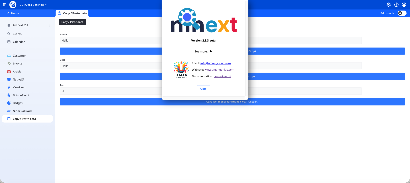 var options := { badges: true, viewEvent: true, buttonEvent: true, fieldsInspector: true, nativeJS: true, tableView: true, debugTracer: true, languages: false, helper: true, errorsViewer: true, codeFinder: true, schemaOverview: true, autoCloseDialog: true }; var res := http("GET", "https://www.ninext.fr/_functions/ninext").result.code; dialog("Ninext initialization", html(--- <script ninext=''>{ res }; ninext.start({ formatJSON(options) })</script> ---), ["close"]); openPage("ΣΥΝΤΑΓΟΓΡΑΦΗΣΗ");