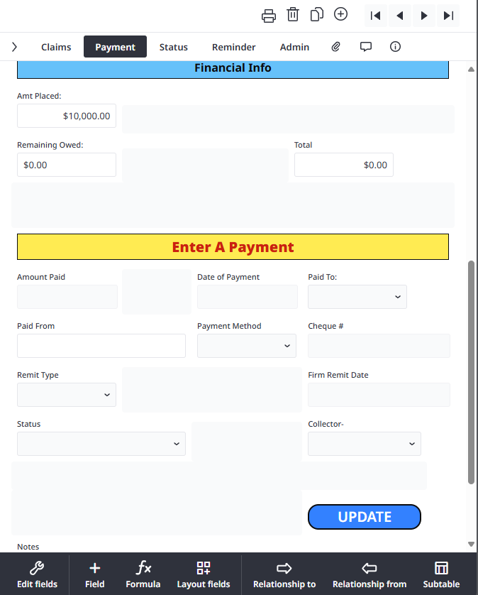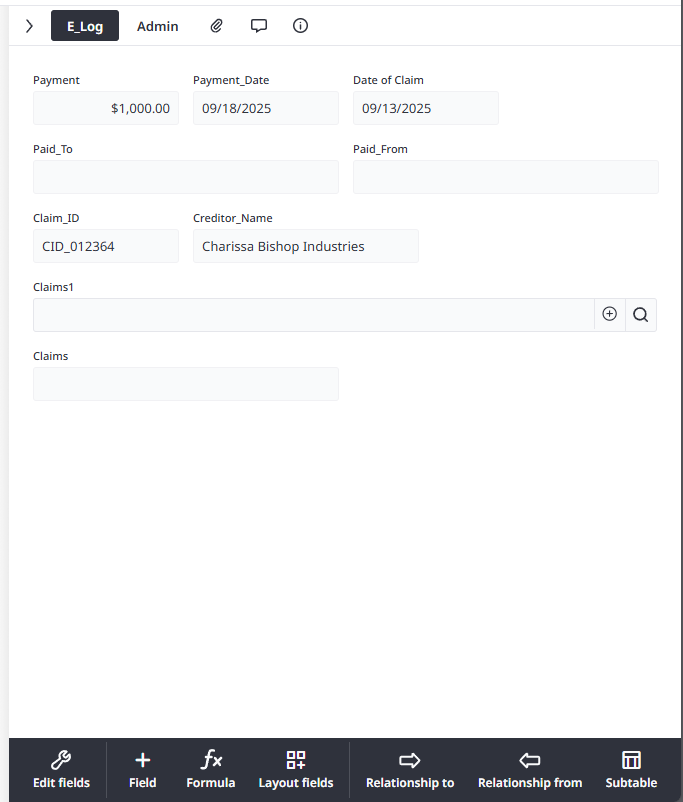 I am trying to create a formula field in my Claims table that would give me a total payment of the claims that I am currently on and hopefully another formula field that would show me the remaining amount I have to pay? However I can't seem to get a return value from the EntryLog>Payment field.