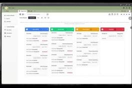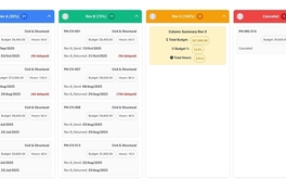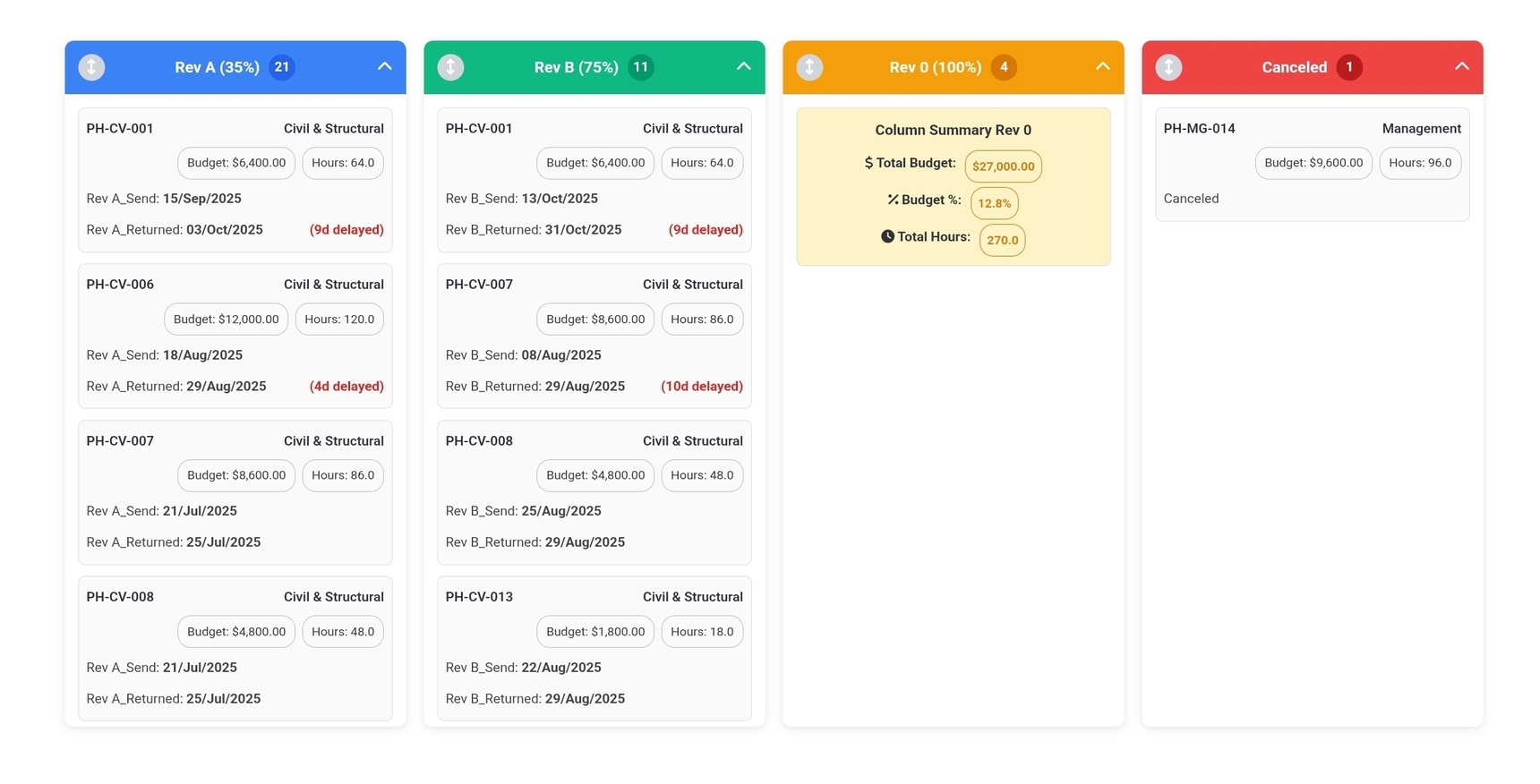 Dynamic Kanban in HTML/CSS/JS, which organizes engineering document revisions (Rev A, Rev B, Rev 0) and canceled documents into columns. It includes budget, time, progress and backlog management, with dynamic backlog filtering functionality using the sort button