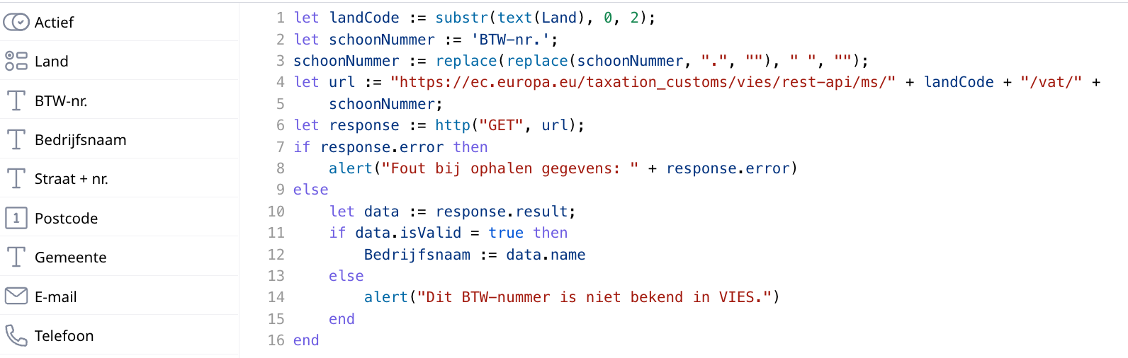 Hi there, I'm trying to get my text fields automatically updated based on the VAT-nr. which is checked on VIES after clicking a button. When I enter the url directly into the Google Chrome search bar, I get a result but I cannot make it work in Ninox, though. Any suggestions to solve this puzzle? Here is what I'm using so far.